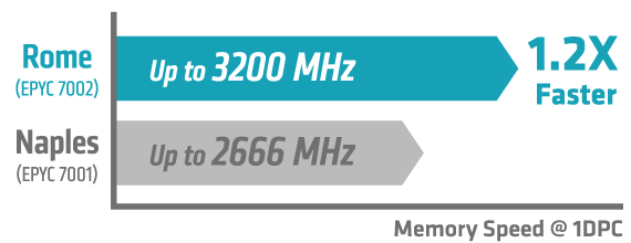 AMD EPYC’s Rome 7002 Series processors feature faster 8 channel DDR4 memory lanes, supporting RDIMM or LRDIMM memory modules with a speed of up to 3200MHz (1 DIMM per channel)