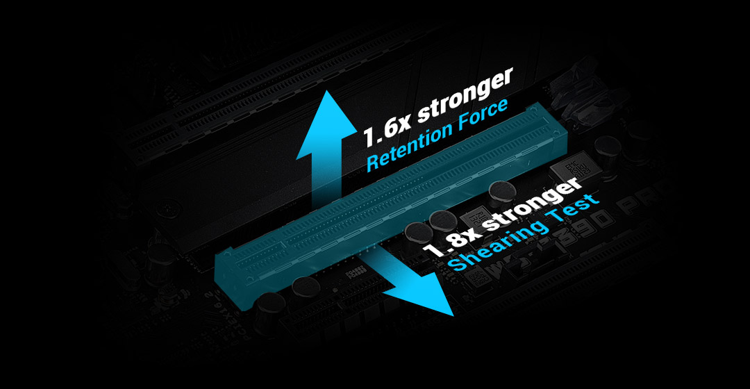 SafeSlot 高強度安全插槽采用一次注塑成型技術制造高強度 PCIe 插槽,提供更強的保持力