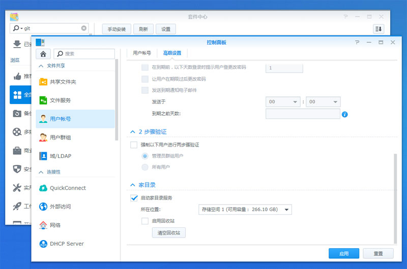 注意:請(qǐng)依次打開NAS控制臺(tái)→控件面板→用戶賬號(hào)→高級(jí)設(shè)置→家目錄,啟用家目錄服務(wù)。